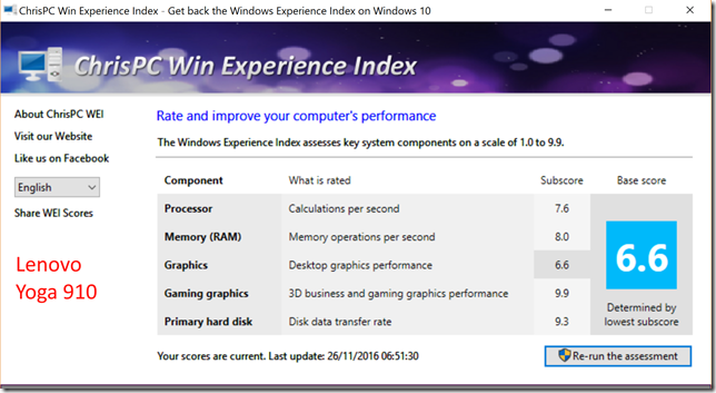 The Windows System Assessment Tool was first introduced by Microsoft in Windows Vista as a means to compare the performance of the hardware of Windows PCs. For Windows Vista and Windows 7, Microsoft provided an applet (the Windows Experience Index applet) to display the results. Although Microsoft no longer provides this applet in Windows 8.1 and Windows 10, the assessment telemetry is still in place and can be used by third-party tools to display the Windows Experience Index. I used the WEI tool from ChrisPC to display the results for all the Yogas: the Yoga 910, Yoga 900, and the Yoga 900s.