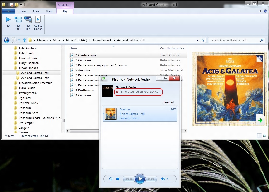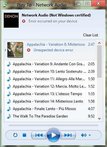 However, this is just one cheer. The Denon is not a “Windows Certified Play to” device, so the Microsoft-supplied Music Modern UI App does not recognise it as a device that can be used in a “Play to” scenario. While I can use the desktop Windows Media Player to “Play to” my Denon (as I could under Windows 7), the new Music App doesn’t even recognise the Denon as a “Play to” device.